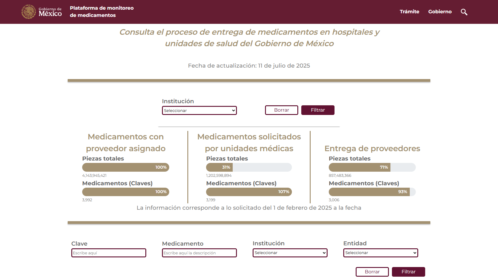 Durante la Mañanera del Pueblo, Clark detalló que en dicho sitio web se puede consultar la situación específica por medicamento y por entidad, así como conocer y revisar el estatus de las piezas de medicamentos entregadas, en tránsito y no entregadas semana a semana.