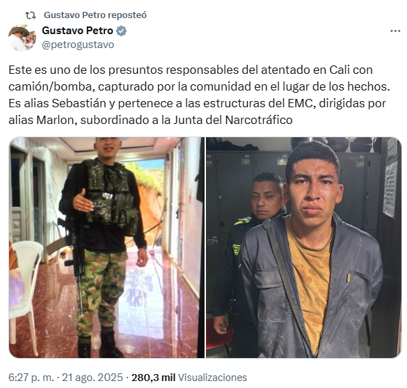 Petro dijo que este “es uno de los presuntos responsables del atentado en Cali con camión/bomba, capturado por la comunidad en el lugar de los hechos”.