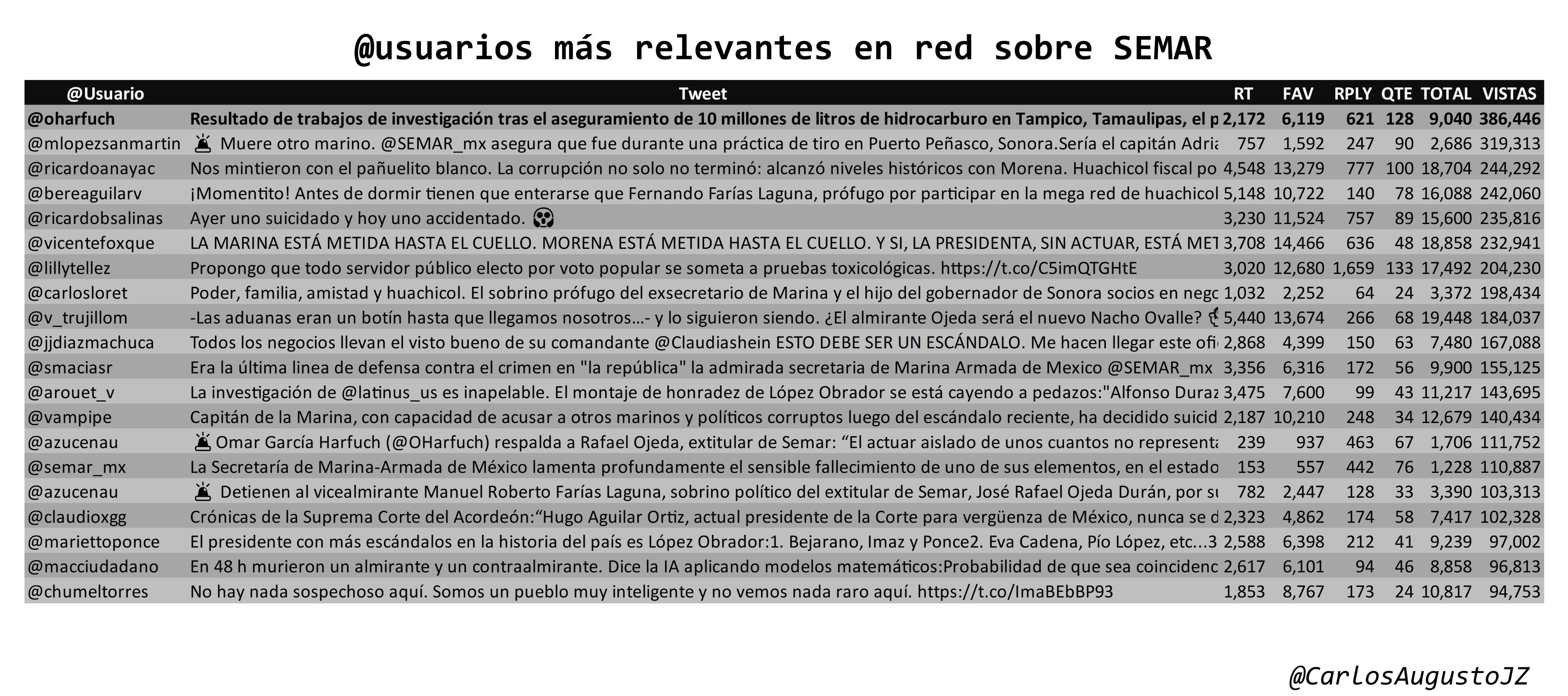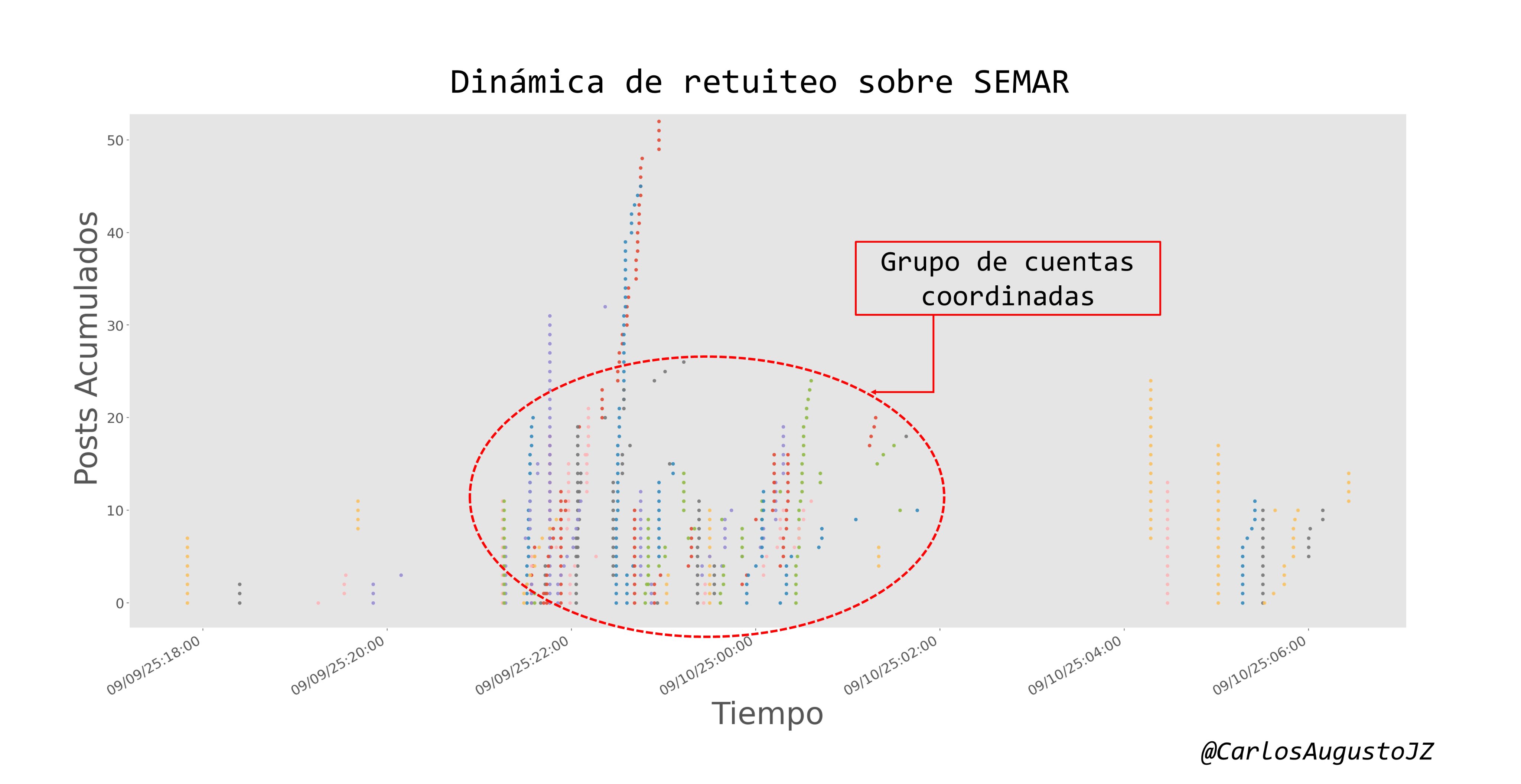 El investigador destacó una red de interacciones “muy bien interconectada que es síntoma de una alta coordinación de ataque”. Algunas de las cuentas que lideraron la falsa narrativa y la crítica a la Secretaría de la Marina (SEMAR) en la red social X, antes Twitter, fueron @vicentefoxque, @ricardoanayac, @felipecalderon y @lillytellez, de acuerdo con Carlos Augusto Jiménez