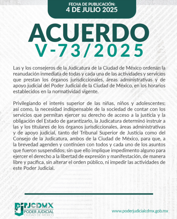 Cabe señalar que el CJCDMX ordenó desde el pasado 4 de julio la reanudación inmediata de todas las actividades, sin embargo, trabajadores del Poder Judicial capitalino denunciaron represalias en su contra, por lo que decidieron no regresar a laborar.