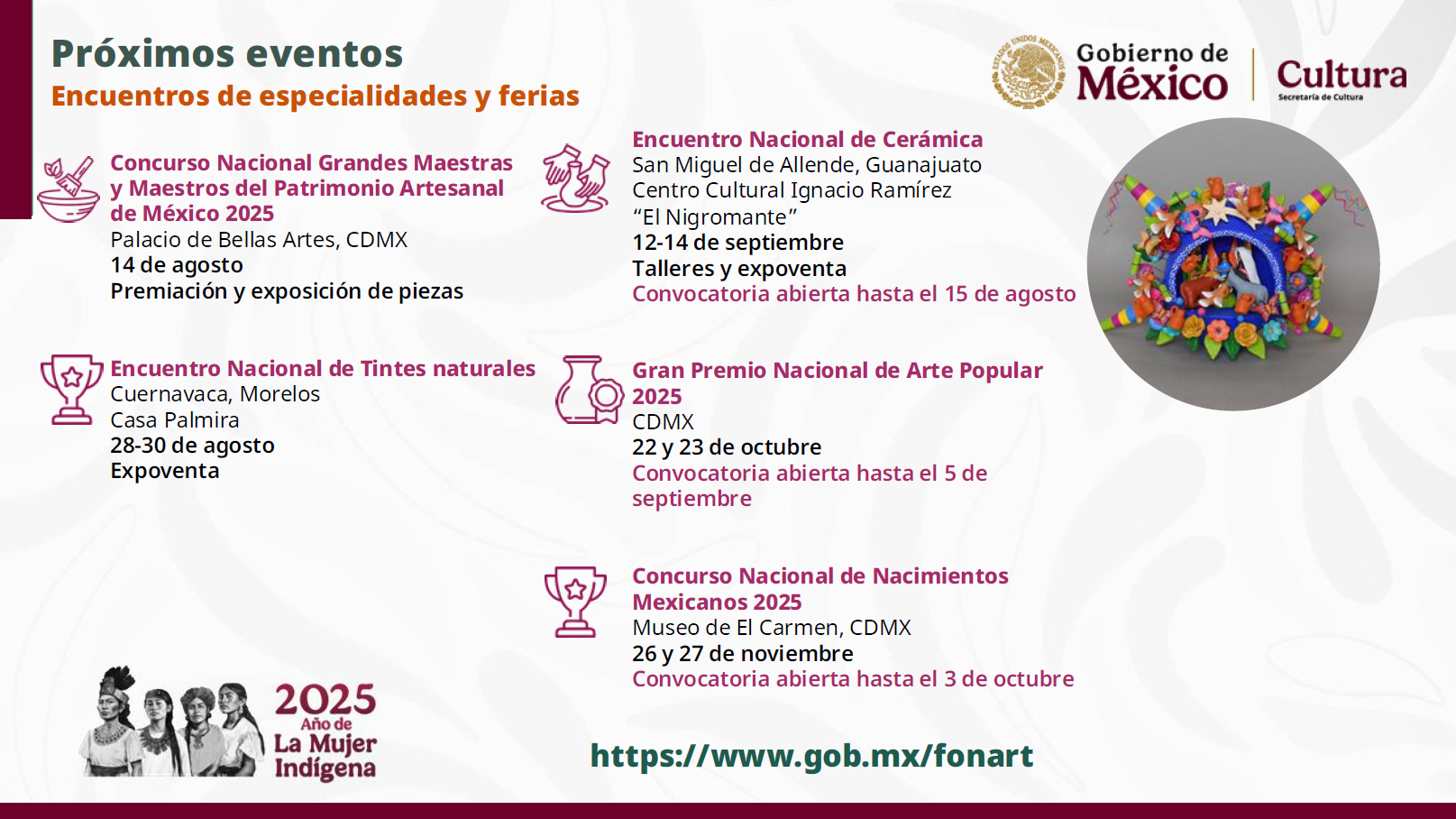 Finalmente, Núñez Bespalova señaló que la venta especial de Fiestas Patrias de Fonart se llevará a cabo del 12 al 14 de septiembre en el Complejo Cultural “Los Pinos” y presentó las convocatorias disponibles en el sitio web www.gob.mx/fonart para que artesanas y artesanos participen en: