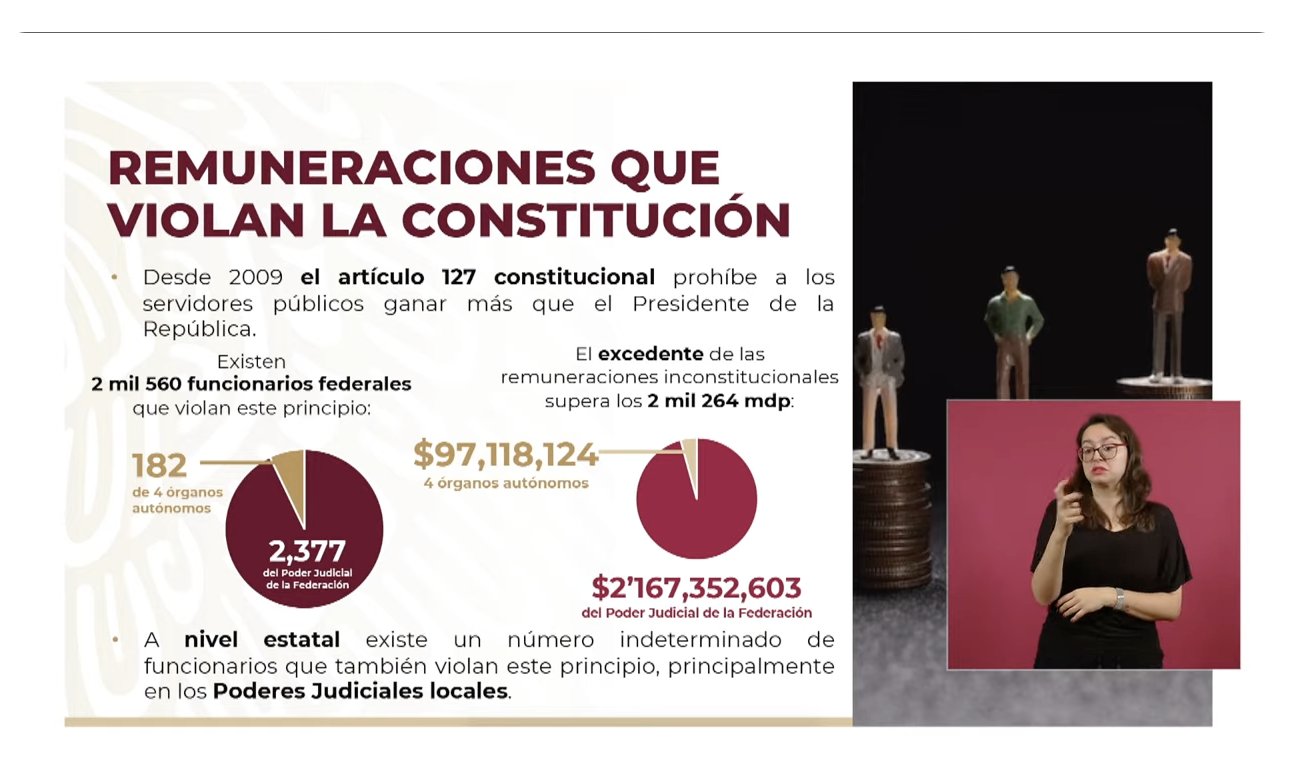La titular de Gobernación explicó que desde el 2019 se prohibió que servidores públicos perciban un salario superior al del presidente de la república. Sin embargo, existen 2 mil 560 funcionarios federales que violan este principio; 2 mil 377 del Poder Judicial de la Federación y 182 de órganos autónomos. El excedente de estas remuneraciones inconstitucionales supera los 2 mil 264 millones de pesos. Esto sin contemplar que en las entidades hay un número indeterminado de funcionarios que también violan este principio.