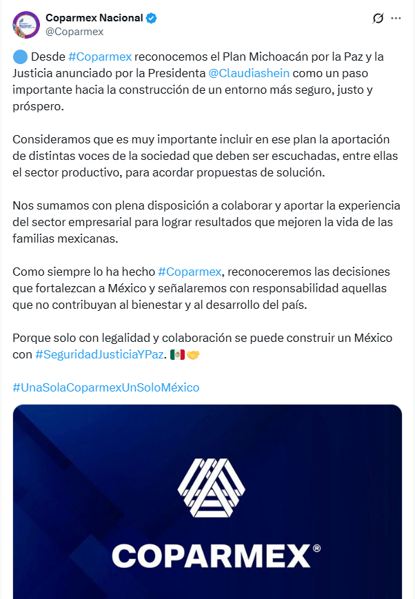 Además del respaldo político, el sector empresarial también manifestó su apoyo. La Coparmex señaló que el plan representa “un paso importante hacia la construcción de un entorno más seguro, justo y próspero” y reafirmó su disposición a colaborar con el gobierno federal para impulsar acciones que mejoren la vida de las familias mexicanas.