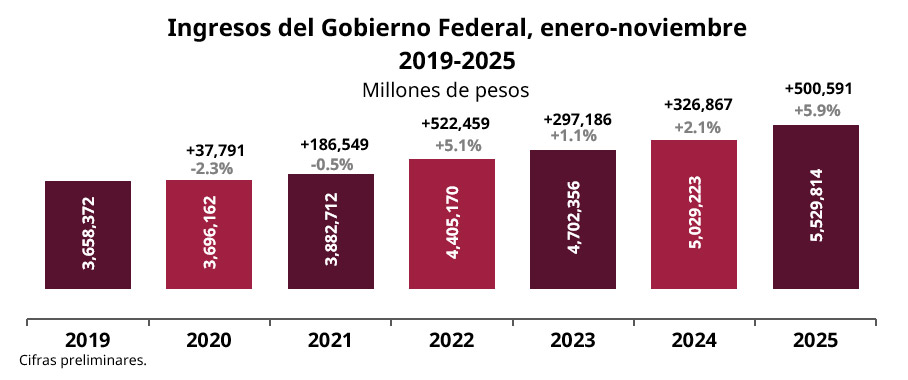 Detalló que la cifra implica un incremento nominal de 500 mil 591 millones de pesos frente a lo contabilizado los primeros 11 meses de 2024; con lo que se supera en 102.3% lo programado en la Ley de Ingresos de la Federación 2025 para ese periodo.