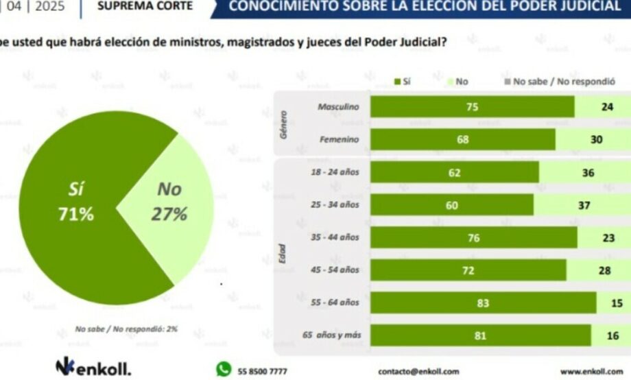 Una encuesta realizada por la agencia Enkoll reveló que 71% de la población sabe que las votaciones serán el domingo primero de junio, mientras que un 27% lo desconocía y dos por ciento no respondió.