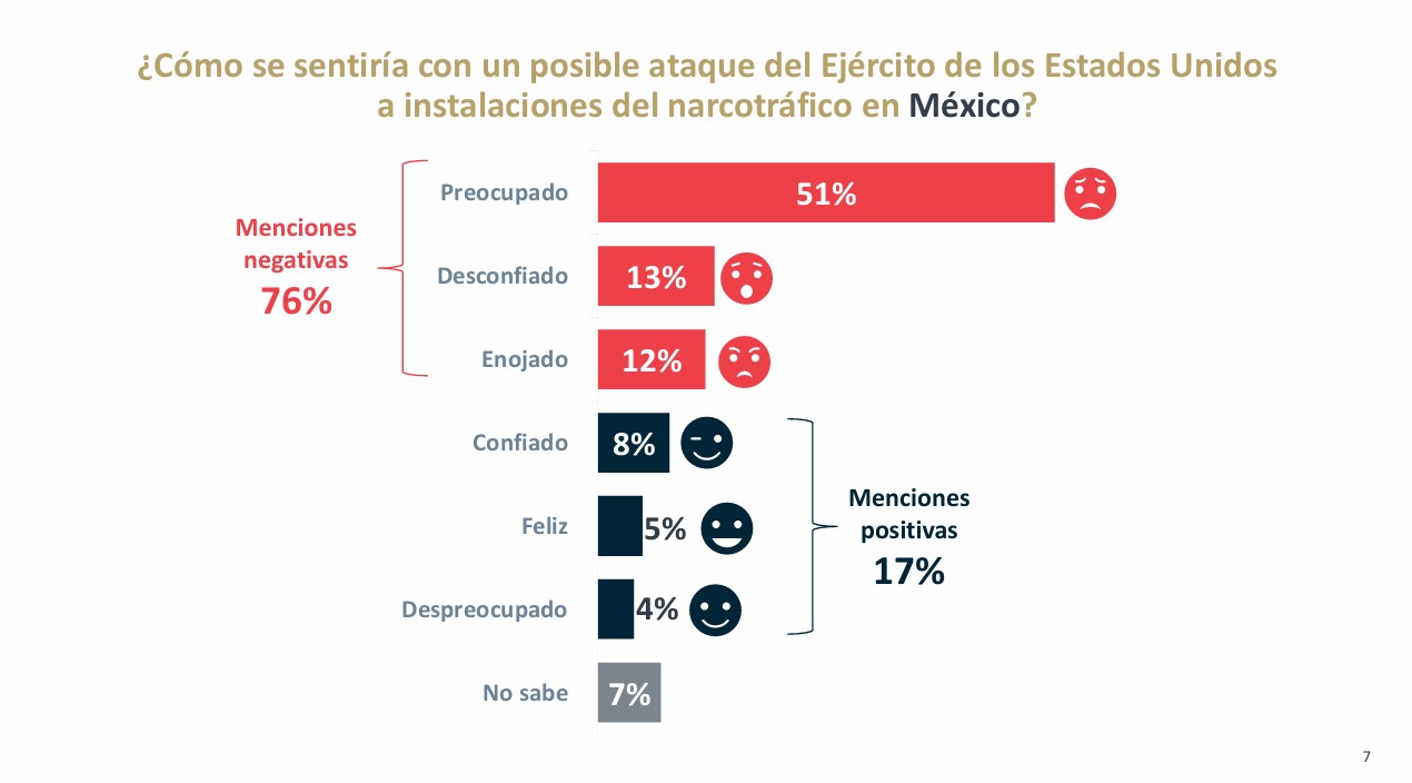 A la pregunta “¿Cómo se sentiría con un posible ataque del Ejército de los Estados Unidos a instalaciones del narcotráfico en México?”, 51% afirmó que se sentiría “Preocupado”, 13% “Desconfiado” y 12% “Enojado”. En tanto, 8% dijo que se sentiría “Confiado”, 5% “Feliz” y 4% “Despreocupado”, mientras que 7% respondió “No sabe”.