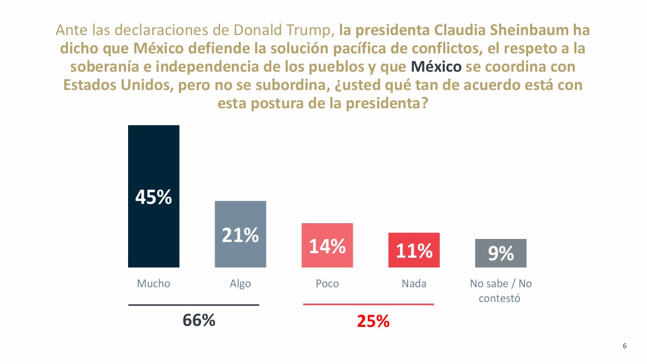 El 66% de los mexicanos está de acuerdo con la postura de la presidenta Claudia Sheinbaum, quien ha señalado que México defiende la solución pacífica de los conflictos, el respeto a la soberanía e independencia de los pueblos, y que se coordina con Estados Unidos sin subordinarse, esto, tras las recientes declaraciones del presidente estadounidense, Donald Trump.