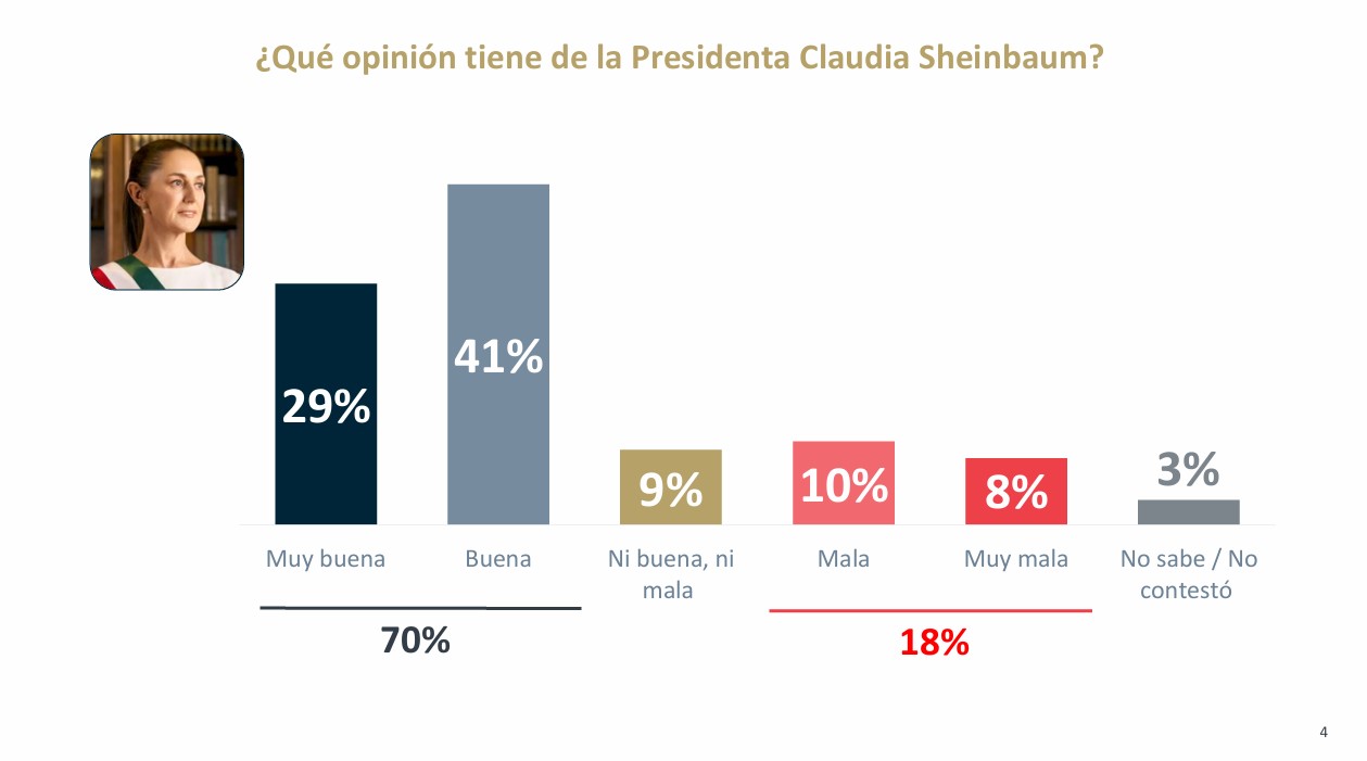 En este contexto, el 70% de los mexicanos afirmó tener una opinión “Buena” o “Muy Buena” de la mandataria, un 18% tiene una opinión “Mala” o “Muy Mala”, mientras que 9% la considera “Ni buena ni mala”.