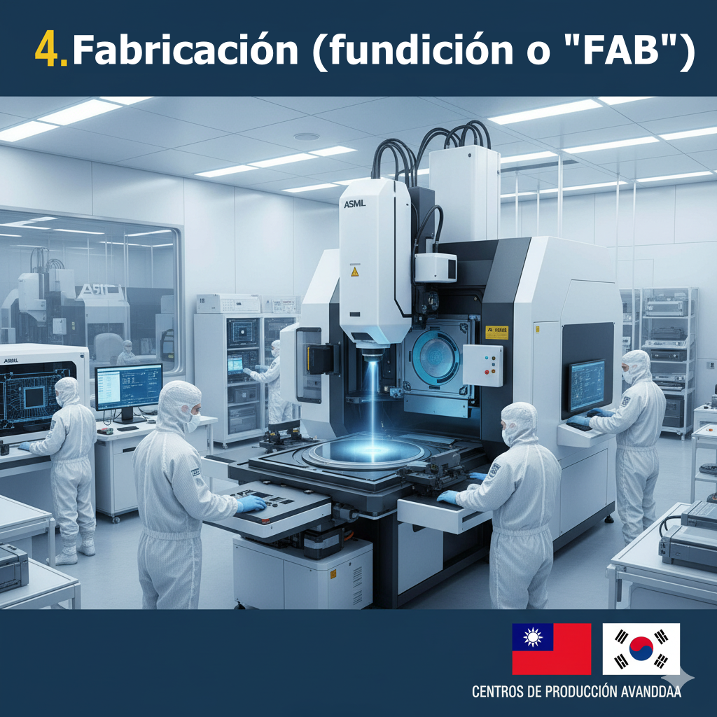 Las obleas de silicio se envían a fundiciones gigantescas, donde máquinas de miles de millones de dólares de fotolitografía, como las de ASML, en Países Bajos, "imprimen" los diseños de semiconductores en las obleas utilizando luz ultravioleta. Es un proceso de cientos de capas en instalaciones más limpias que un quirófano y representa el paso más caro de la cadena de creación de semiconductores