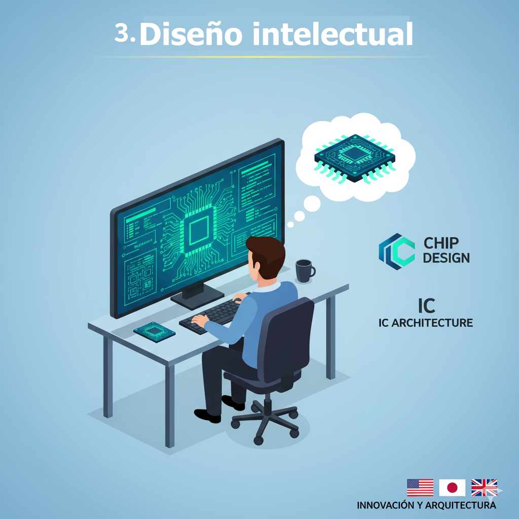 Empresas sin fábrica o "fabless", como NVIDIA, Apple y Qualcomm, crean la arquitectura de los chips y diseñan planos multimillonarios para los semiconductores. Tanto el proceso de arquitectura, como el software que usan, EDA, es dominado principalmente por empresas estadounidenses y la compañía Arquitectura Arm del Reino Unido.