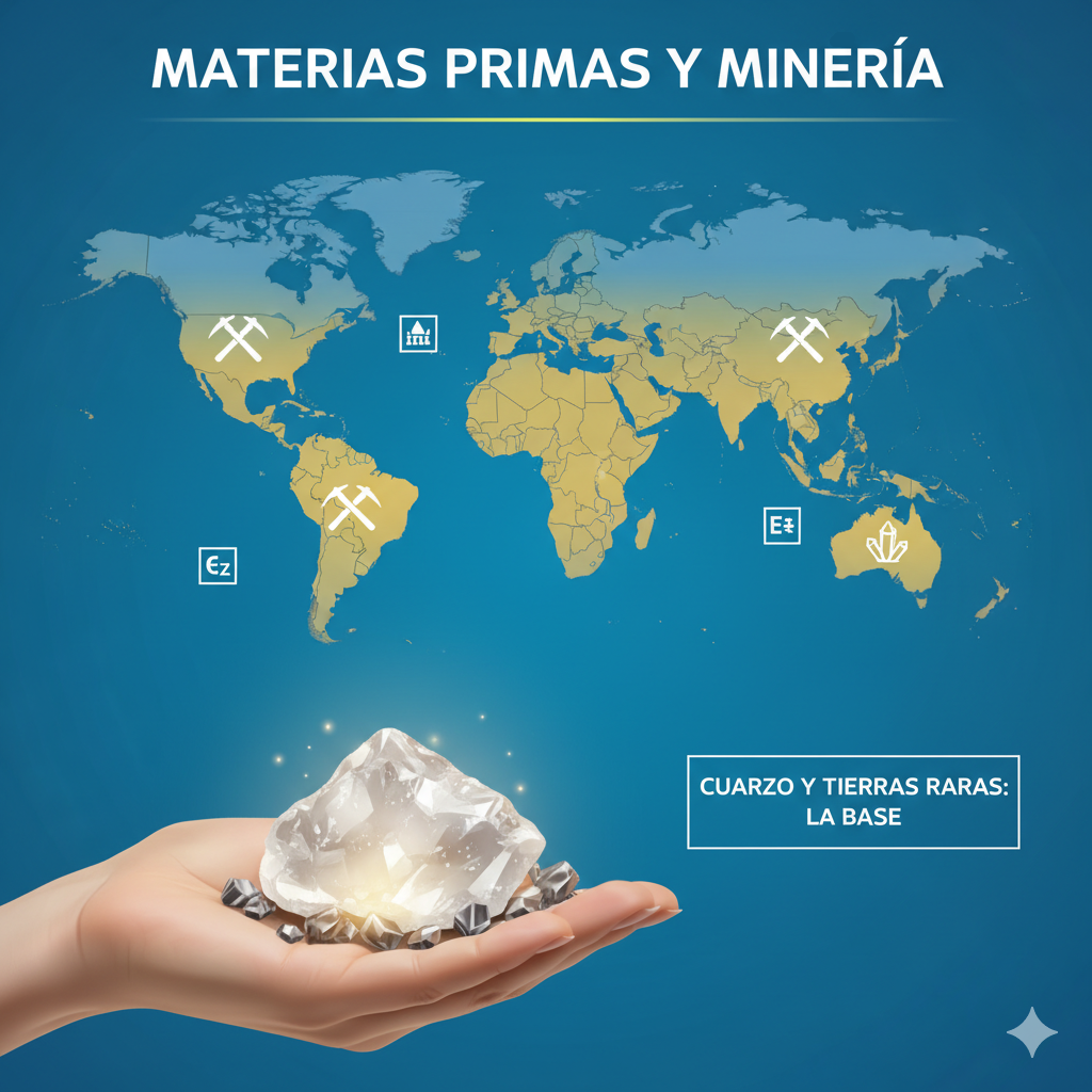 Todo chip empieza como arena. El cuarzo se extrae y se purifica para obtener silicio de alta pureza. También se requieren "tierras raras", cuyo procesamiento está dominado en un 90% por China, y otros minerales.