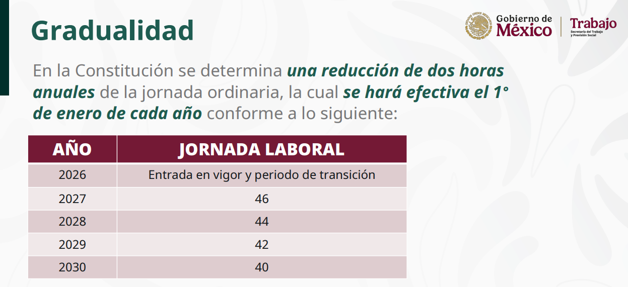 Al respecto, el secretario del Trabajo y Previsión Social, Marath Bolaños, informó que 2026 funcionará como un periodo de adecuación posterior a la aprobación del dictamen, a fin de que empleadores y trabajadores puedan adaptar sus procesos productivos a la nueva disponibilidad de tiempo.