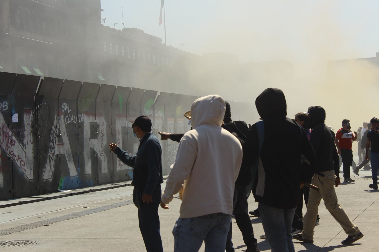 Al llegar al amurallado Zócalo capitalino, la tensión se hizo tangible. Entre petardos y el estallido de bombas molotov, los manifestantes se dividieron en dos grupos. El primero, el más visible y activo, compuesto por adultos vestidos de negro, corrió hacia la plancha del Zócalo y comenzó a trepar y golpear las vallas metálicas frente al Palacio Nacional con herramientas, palos, fierros, machetes y esmeriles.
