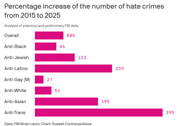 Los crímenes de odio en contra de la población de origen latino alcanzaron un máximo histórico en 2025 en Estados Unidos, incrementando en 239% desde 2015, de acuerdo con un informe realizado por la agencia estadounidense Axios.