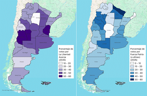 Después de este proceso electoral, ambas cámaras del Congreso argentino se encontrarán organizadas en tercios. En el caso de la Cámara de Diputados, la conformación para el periodo 2025-2027 será de 97 curules para Fuerza Patria, 93 para La Libertad Avanza, 17 para Provincias Unidas, 14 para Propuesta Republicana, 12 para las Fuerzas Provinciales, 4 para el Frente de Izquierda-Unidad, 3 para la Unión Cívica Radical y 17 para otros partidos políticos minoritarios. La Libertad Avanza logró superar la presencia en un tercio de la cámara, proporción que le permitirá hacer frente a las insistencias del Congreso contra los vetos ejecutivos; no obstante, aún se encuentra lejos de la mayoría al interior de la cámara, por lo que necesitará negociar por lo menos con 36 congresistas para hacer avanzar propuestas importantes. Por otro lado, el Senado estará conformado por 26 miembros de Fuerza Patria, 20 de La Libertad Avanza, 9 de la Unión Cívica Radical, 6 de las Fuerzas Provinciales, 6 de Propuesta Republicana y 5 de Provincias Unidas. Aunque la distribución del Senado también está volcada a un sistema de tercios entre Fuerza Patria, La Libertad Avanza y los partidos minoritarios, en esta cámara es más posible que la ultraderecha avance con su sistema de negociaciones. La Libertad Avanza está cuatro curules por debajo de lo necesario para resistir los rechazos de veto (24); sin embargo, la posibilidad de negociación con Propuesta Republicana y con la Unión Cívica Radical hace que esta labor pueda ser resuelta fácilmente.