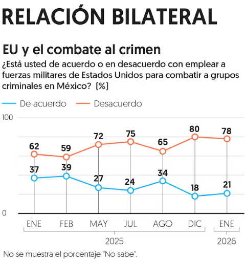 El 78 % de los mexicanos se manifiesta en contra de cualquier injerencia militar de Estados Unidos en territorio nacional, mientras que solo el 21 % estaría de acuerdo con una intervención de ese tipo. Además, la mayoría mantiene una opinión negativa sobre Donald Trump y su política migratoria.
