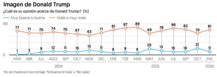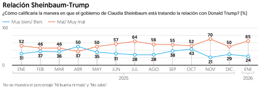 Por otro lado, para enero de 2026, el 65 % de los encuestados aprueba la relación entre la presidenta Claudia Sheinbaum y Donald Trump, valorando una postura ecuánime y abierta al diálogo.