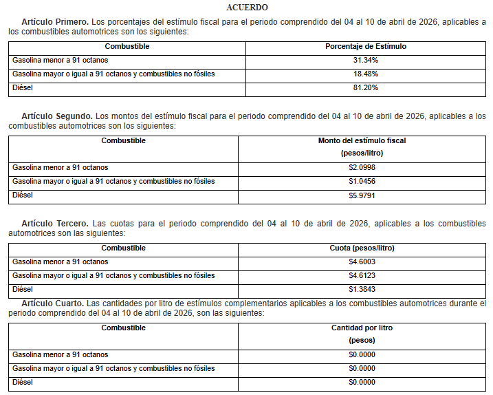 El acuerdo establece un esquema diferenciado de estímulos fiscales al Impuesto Especial sobre Producción y Servicios para el periodo del 4 al 10 de abril de 2026. Destaca el alto apoyo al diésel, con un estímulo de 81.20%, muy por encima del aplicado a las gasolinas: 31.34% para la de menos de 91 octanos y 18.48% para la de mayor octanaje. En términos monetarios, esto se traduce en un subsidio de hasta 5.9791 pesos por litro para el diésel, mientras que las gasolinas reciben apoyos considerablemente menores, de 2.0998 y 1.0456 pesos por litro, respectivamente.