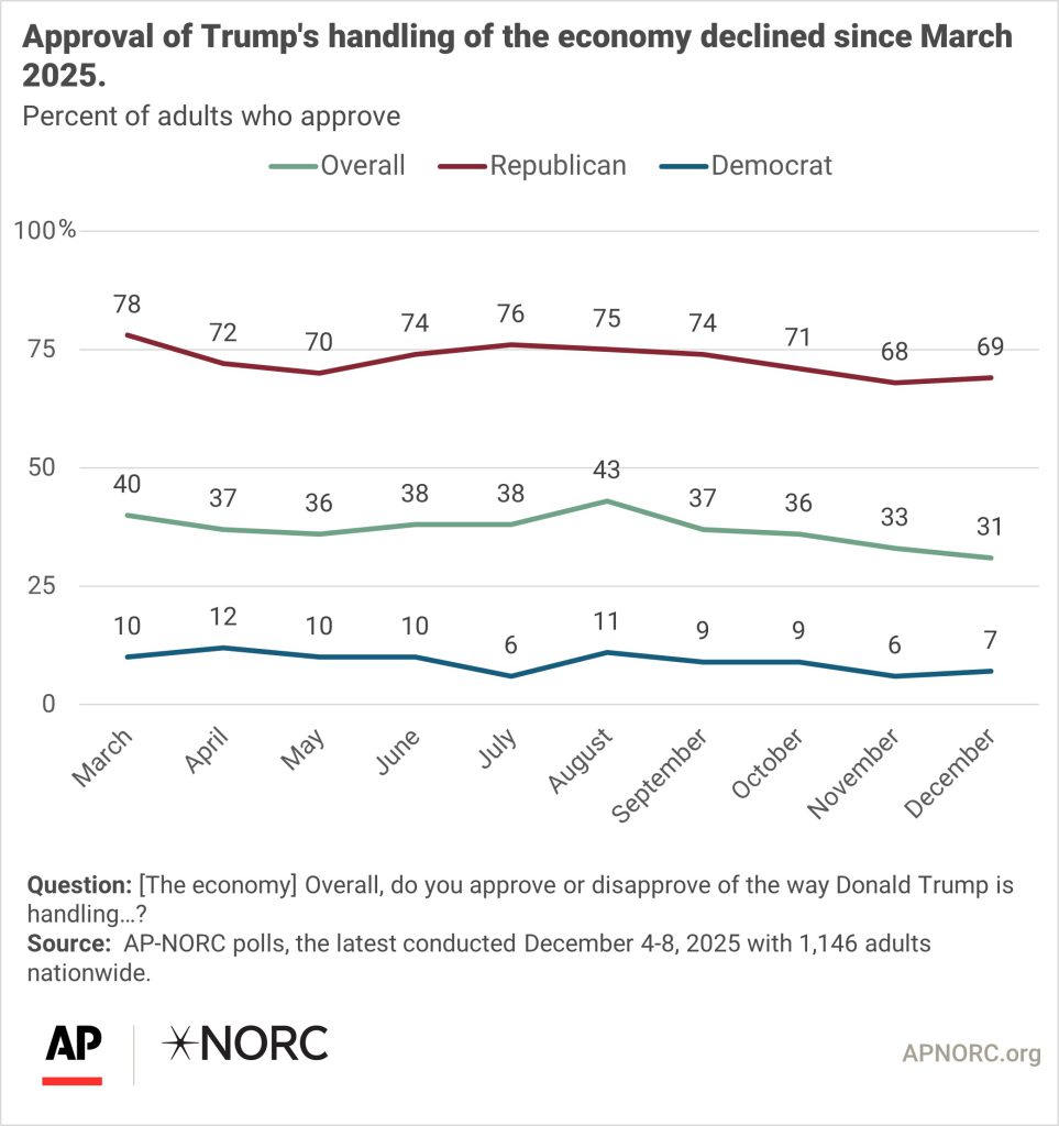 A poco de cumplir su primer año en el segundo mandato, el 20 de enero de 2026, el presidente de Estados Unidos, Donald Trump, ha perdido apoyo en temas como economía y migración, con una caída de alrededor de 10 puntos desde marzo. La seguridad fronteriza se mantiene como su rubro mejor evaluado, con 50% de aprobación. Esto según encuestas de Associated Press y el Centro Nacional de Investigación de Opinión (NORC) de la Universidad de Chicago, publicadas el 11 de diciembre de 2025.