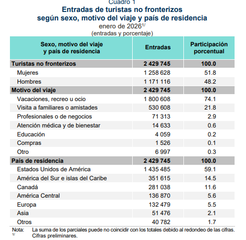 Además, en dicho periodo, las y los turistas no fronterizos sumaron 2,429,745 visitantes, un crecimiento anual de 1.7%, y representaron 56.7% de las y los turistas internacionales. En tanto, el 43.3 % restante se concentró en turistas fronterizos, quienes registraron 1,857,841 entradas, 19.2 % más que en enero de 2025.