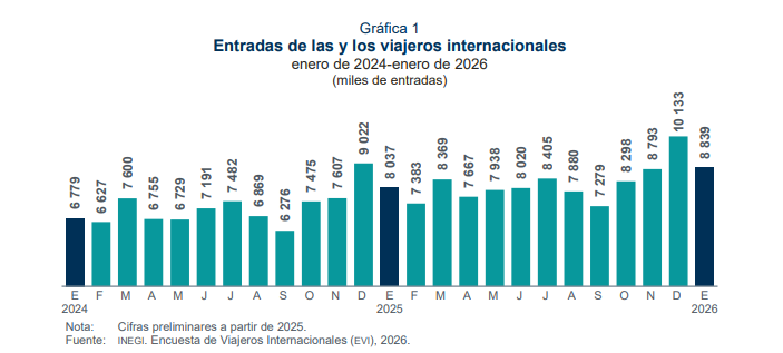 En enero de 2026 ingresaron al país 8,838,914 viajeras y viajeros internacionales, 10.0% más que en el mismo mes de un año previo, de los cuales 4,287,586 (48.5 %) entraron como turistas internacionales y 4,551,328 (51.5%) excursionistas internacionales, de acuerdo con datos del Instituto Nacional de Estadística y Geografía (INEGI).