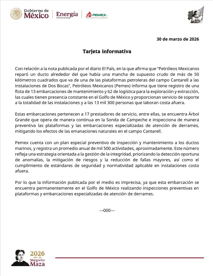 A través de una tarjeta informativa difundida el 30 de marzo de 2026, la empresa estatal aclaró que no tiene registro de un ducto reparado por una mancha de más de 50 kilómetros cuadrados, como señaló el medio.