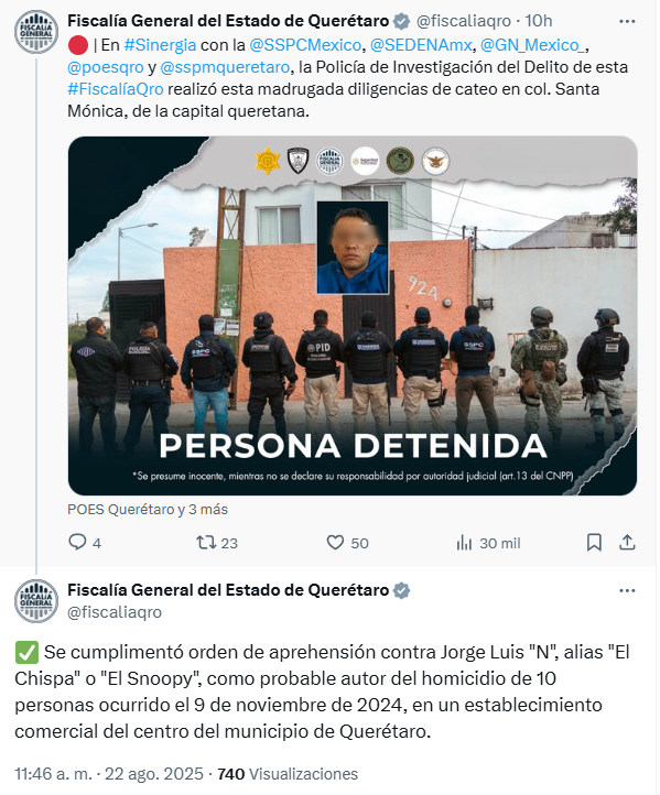 La Fiscalía General del Estado de Querétaro detuvo este 22 de agosto a Jorge Luis "N", alias "El Chispa" o "El Snoopy", quien presuntamente habría sido el autor del homicidio de 10 personas, el cual ocurrió el 9 de noviembre de 2024 en el centro nocturno de "Los Cantaritos".