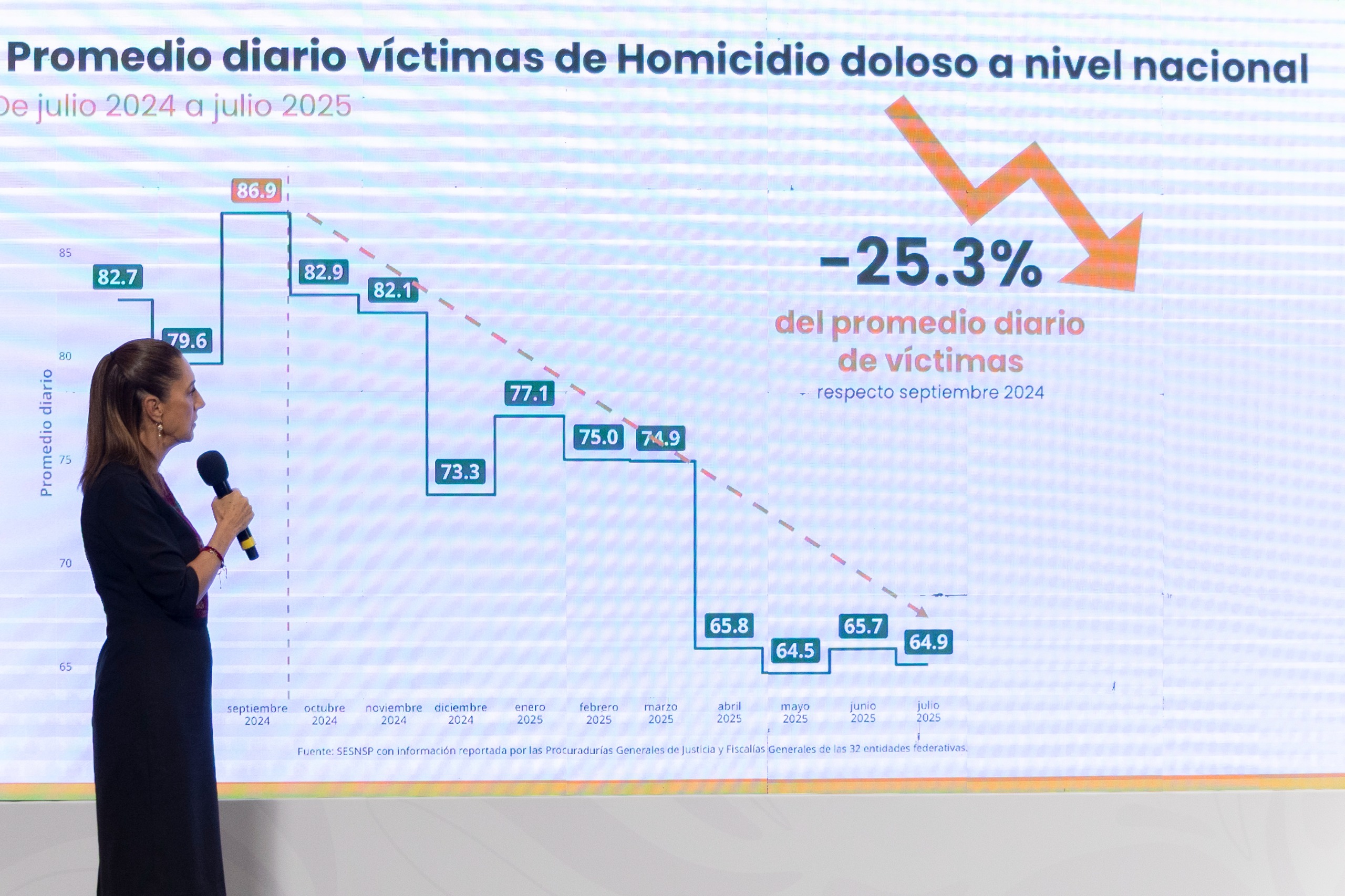El titular de la Secretaría de Seguridad y Protección Ciudadana (SSPC), Omar García Harfuch, informó, este 27 de agosto, que, desde el inicio de la administración de la presidenta Claudia Sheinbaum, el índice de homicidio doloso ha registrado una disminución del 25.8%.