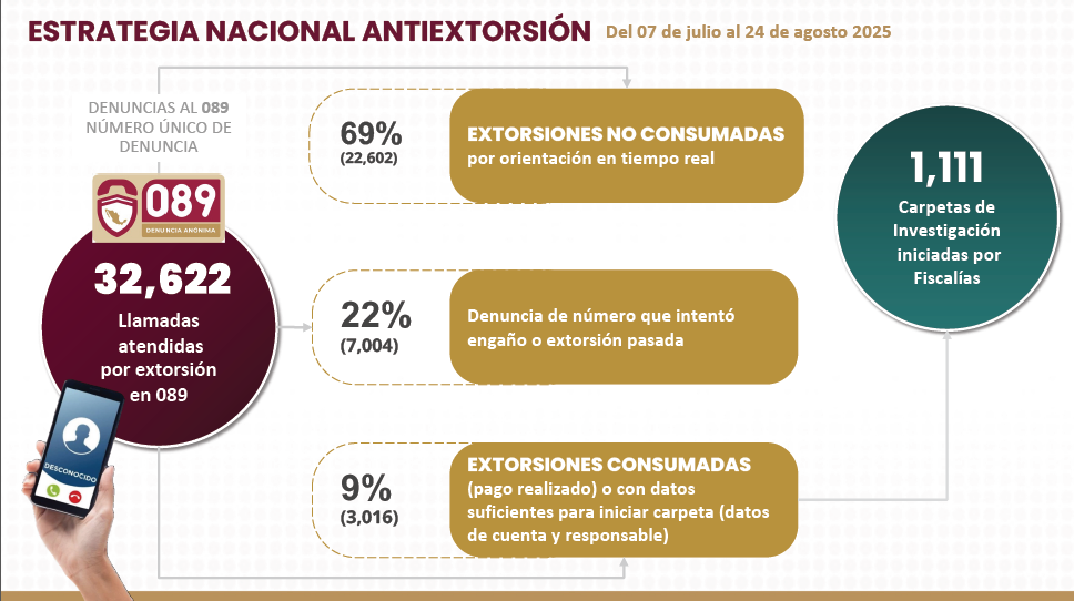Respecto a la Estrategia Nacional Antiextorsión, Omar García Harfuch indicó que desde el inicio de sus operaciones se han registrado 32 mil 622 llamadas en la línea 089 y señaló que de estas: el 69% fueron extorsiones no consumadas por orientación en tiempo real; en el 22% de las llamadas se otorgó atención a personas que se comunicaron para denunciar un número que intentó cometer este delito así como una extorsión pasada y el 9% se trató de denuncias de extorsiones consumadas, que fueron turnadas a las fiscalías locales para darles seguimiento y realizar las investigaciones correspondientes.