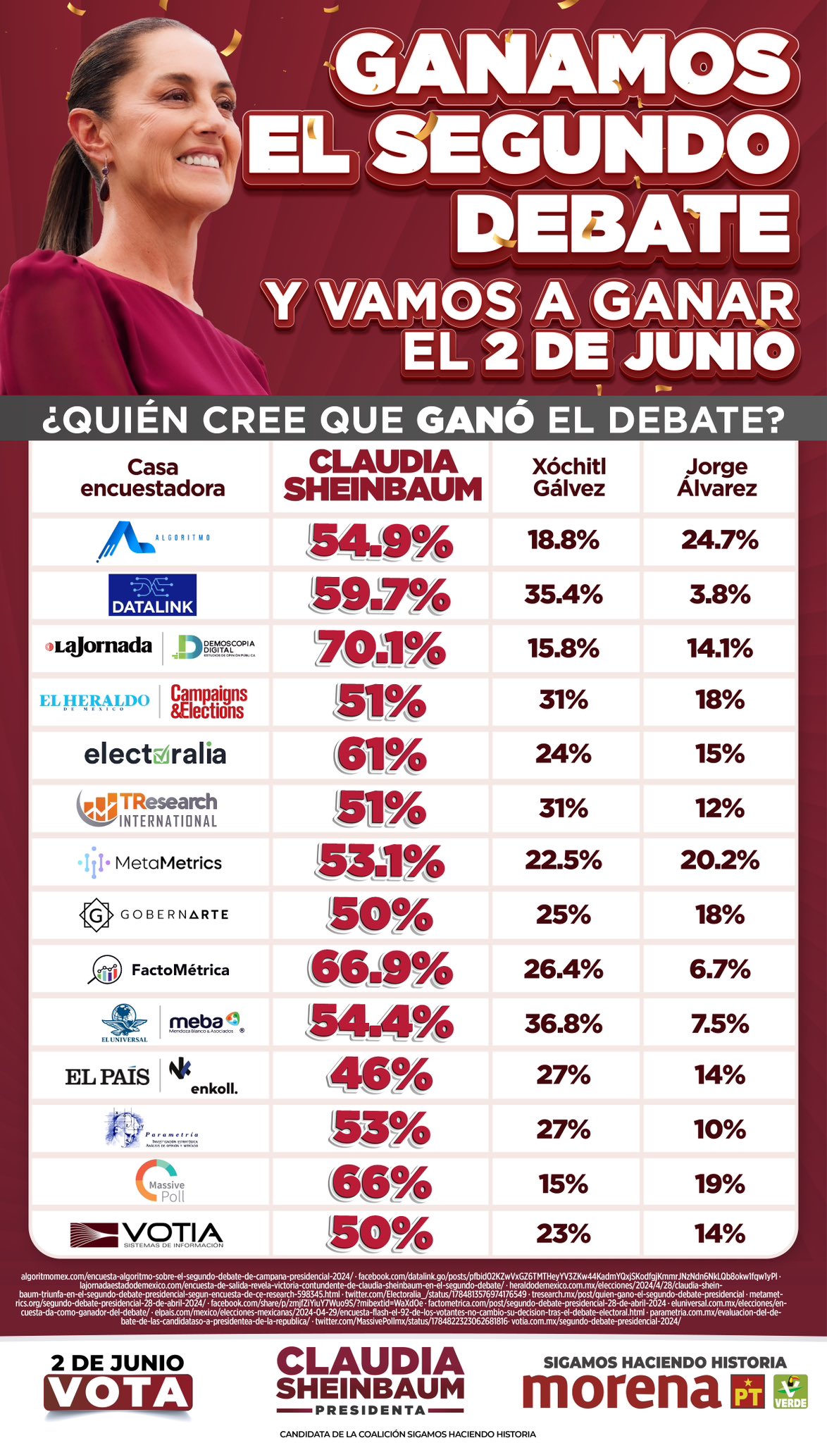 Distintas encuestadoras realizaron sondeos para conocer la opinión de la ciudadanía que observó el segundo debate presidencial, en la mayoría de las encuestas, Claudia Sheinbaum fue quien obtuvo la mayoría de las opiniones que creyeron que ganó.