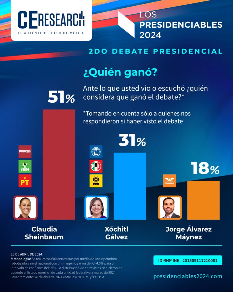El sondeo publicado por la compañía Campaigns&Elections registró que el 51% de los encuestados dieron por ganadora a Claudia Sheinbaum, el 31% señaló que la ganadora fue Xóchitl Gálvez y el 18% fue Jorge Álvarez Máynez.