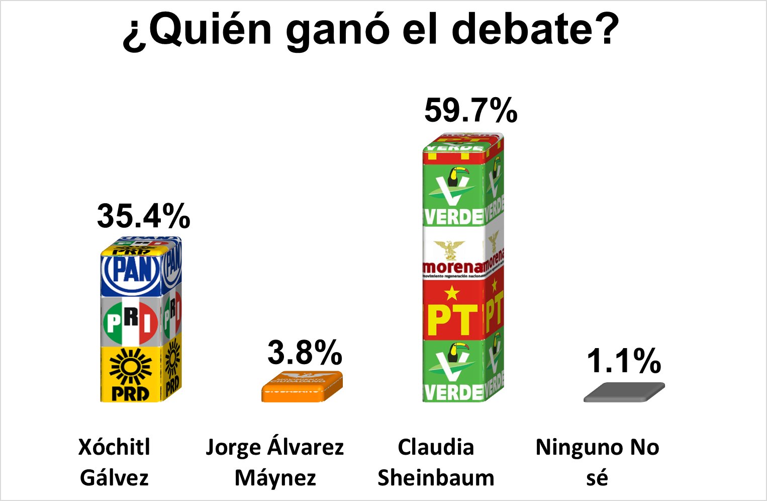 El sondeo que realizó Datalink expone que el 59.7% de los encuestados por esta empresa dijo que Claudia Sheinbaum ganó el debate, el 35.4% indicó que la ganadora del debate fue Xóchitl Gálvez y que el ganador fue Jorge Álvarez Máynez opinó el 3.8%.