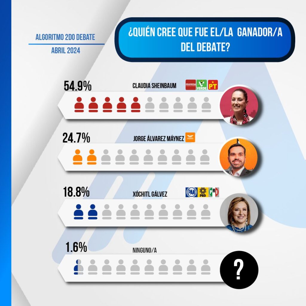 En cuanto a la encuesta que realizó Algoritmo, 59.4% de los encuestados indicó que Claudia Sheinbaum ganó el debate, 24.7% opinó que Jorge Álvarez Máynez ganó el debate y el 18.8% mencionó que fue Xóchitl Gálvez quien ganó el debate.