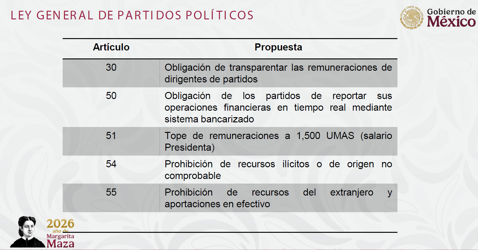 Asimismo, la presidenta recordó que su propuesta inicial de Reforma Electoral no obtuvo la mayoría calificada, pues solo fue respaldada por Morena, algunos diputados del Partido Verde y del Partido del Trabajo, pero su compromiso es “seguir insistiendo” en que no se gaste tanto en los procesos electorales, mayor y mejor fiscalización en los recursos que reciben los partidos, limitar los salarios a que nadie pueda ganar más que la Presidenta y que no se otorguen bonos.