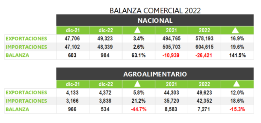 Asimismo, las importaciones agroalimentarias totales alcanzaron el valor de 42 mil 352 millones de dólares, lo que significa un 18.6% más que en el año 2021. Ante estos resultados, la balanza comercial se mantiene con un superávit de 7 mil 271 millones de dólares, pero con saldo menor en 15.3% respecto al 2021.
