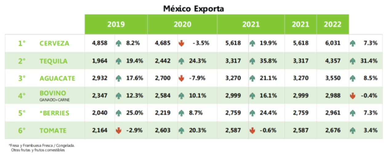 El producto agroalimentario mexicano que más se exportó durante todo el 2022 fue la cerveza con un registro de 6 mil 31 millones de dólares, dejando un incremento del 7.3%, respecto al 2021. Después en segundo lugar estuvo el tequila con un valor de 4 mil 357 millones de dólares, lo que significó un aumento del 31.4%, comparado con el año anterior. En tercer lugar, apareció el aguacate con un valor de 3 mil 550 millones de dólares, lo que equivale un aumento del 8.5% en comparación con el 2021.