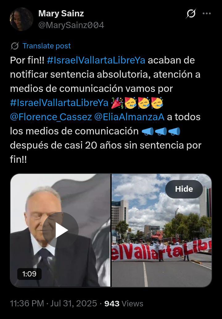 A través de su cuenta de X, Mary Sainz escribió el 31 de julio: "Por fin!! #IsraelVallartaLibreYa acaban de notificar sentencia absolutoria, atención a medios de comunicación vamos por #IsraelVallartaLibreYa [...] a todos los medios de comunicación [...] después de casi 20 años sin sentencia por fin!!".
