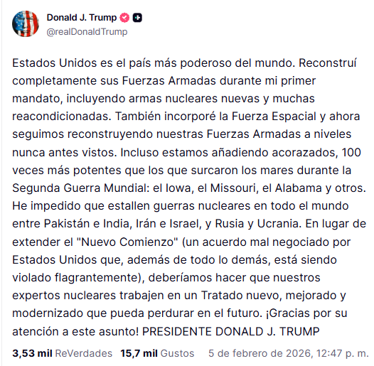 Trump publicó en la red Truth Social que, en lugar de extender el Nuevo START —al que calificó como un acuerdo mal negociado y presuntamente violado—, “debería hacerse que expertos nucleares estadounidenses trabajen en un tratado nuevo, mejorado y modernizado que pueda perdurar en el futuro”.