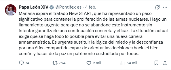 El Papa León XIV pidió no abandonar el tratado, al considerarlo un instrumento clave para contener la proliferación nuclear y evitar una nueva carrera armamentista, y llamó a garantizar un seguimiento eficaz en favor del desarme y la confianza mutua.