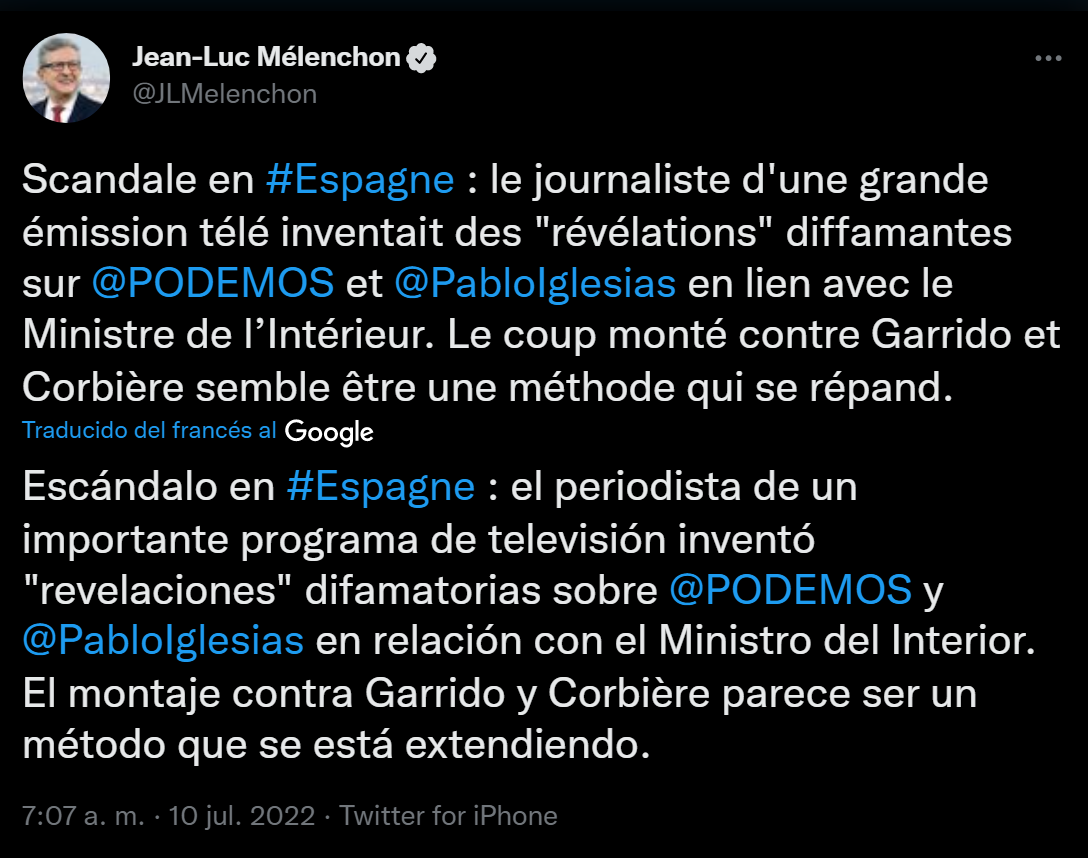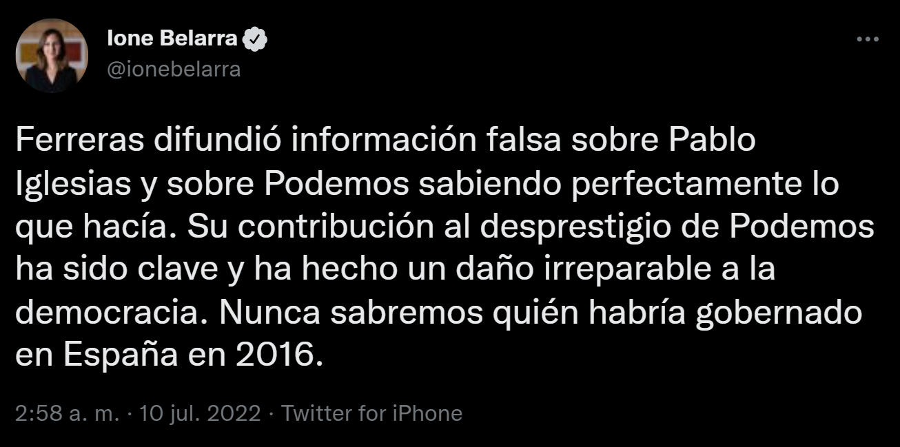 Por su parte, Ione Belarra, secretaria general de Podemos y ministra de Derechos Sociales y Agenda 2030, aseguró en un tuit en su cuenta oficial que el periodista Antonio García Ferreras difundió información falsa sobre Pablo Iglesias y la agrupación política, aseverando que su participación en esta campaña de desprestigio “ha sido clave” para generar un daño irreparable a la democracia.