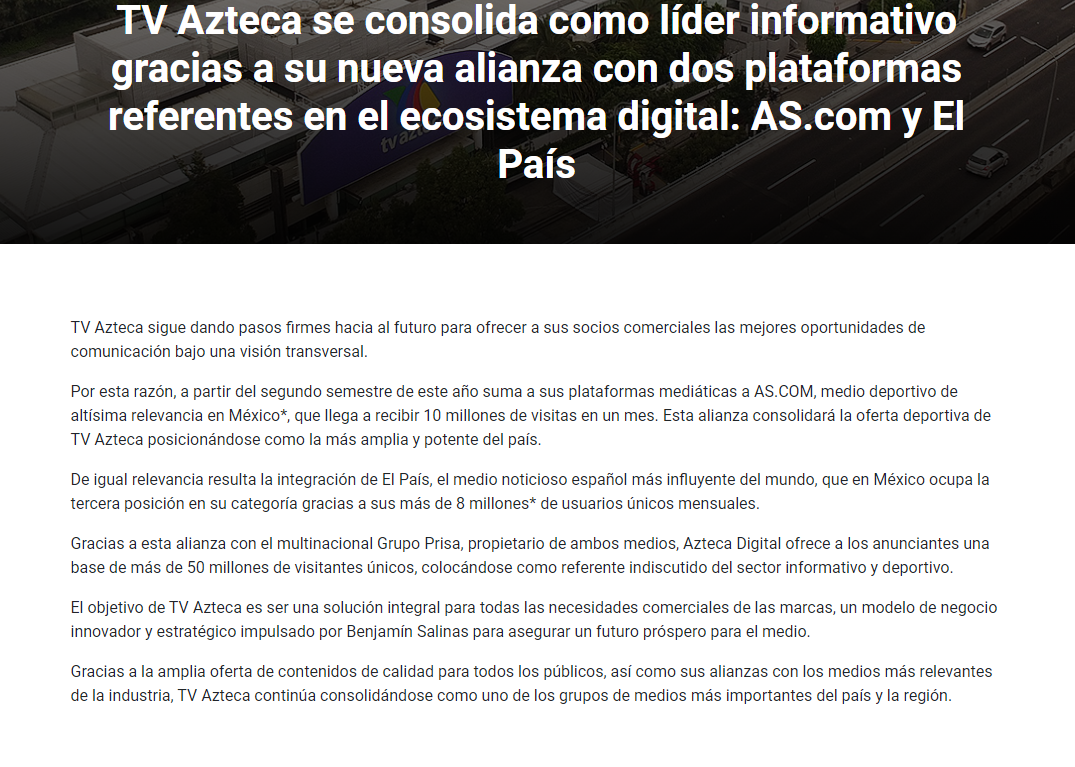 En el comunicado de prensa, Tv Azteca destaca la influencia de El País, “el medio noticioso español más influyente del mundo, que ocupa la tercera posición en su categoría gracias a sus más de 8 millones de usuarios únicos mensuales.” Mientras que la alianza con el medio deportivo As.com fue justificada por su “altísima relevancia en México, que llega a recibir 10 millones de vistas en un mes”.