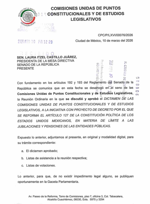 En sesión vespertina este 11 de marzo, el Senado de la República aprobó por unanimidad, con 116 votos a favor, en lo general y los artículos no reservados del dictamen en materia de montos de pensiones y jubilaciones con recursos públicos.