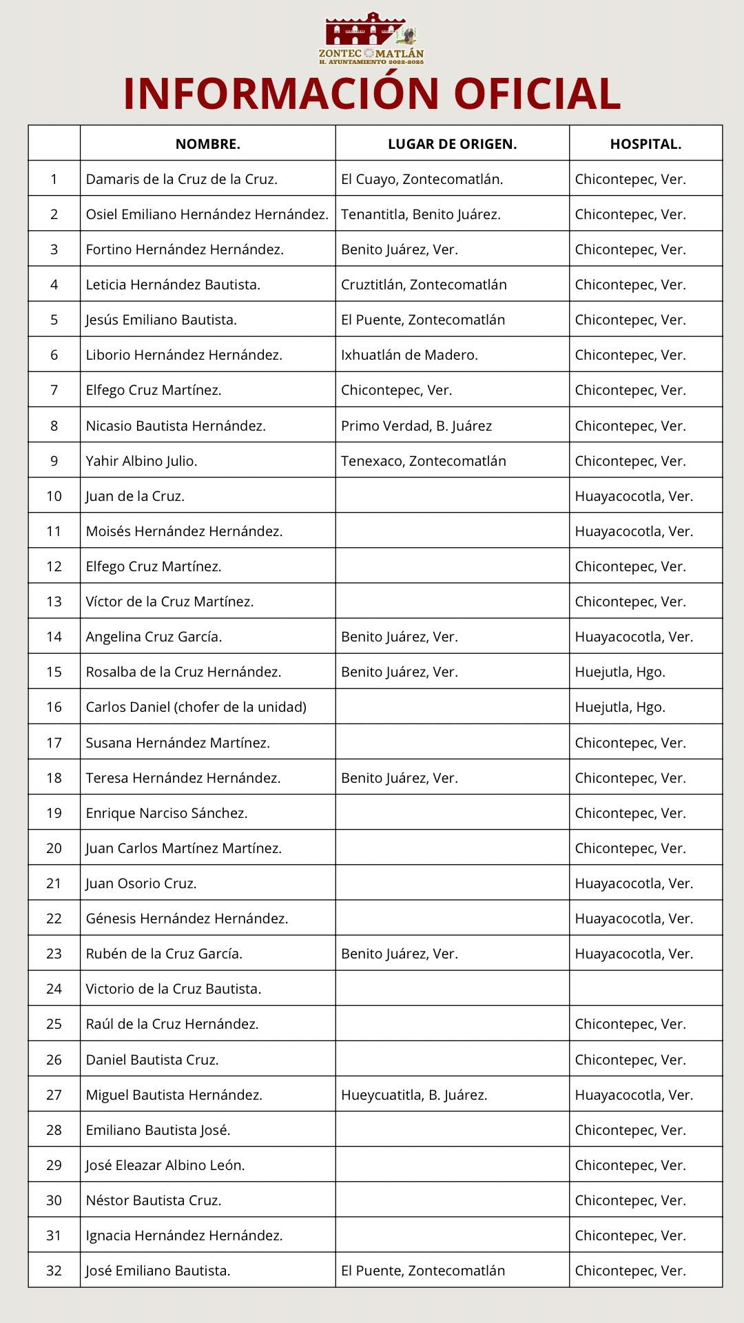 Indicó que, por instrucciones de la gobernadora de Veracruz, Rocío Nahle, se dispuso brindarles la mejor y más pronta atención posible. Asimismo, informó que el gobierno municipal mantiene comunicación permanente para dar a conocer la procedencia y ubicación de las personas heridas, con el objetivo de facilitar el acompañamiento y apoyo a los familiares.