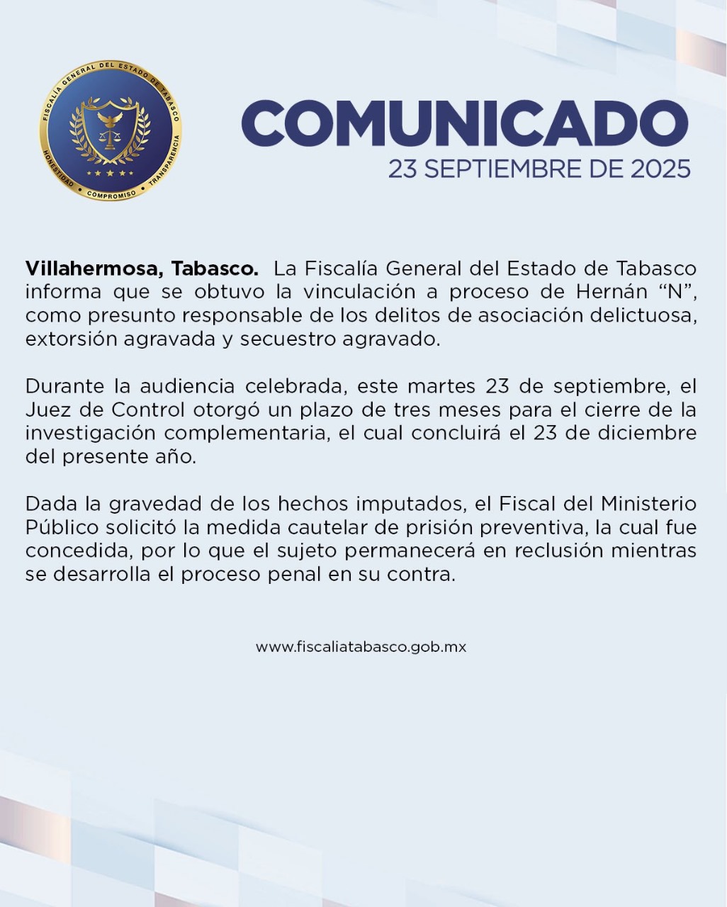Hernán “N”, exsecretario de Seguridad Pública de Tabasco, fue vinculado a proceso este 23 de septiembre durante la audiencia inicial de imputación en su contra, realizada de manera remota desde los juzgados de Villahermosa. Actualmente permanece recluido en el penal de máxima seguridad de El Altiplano, en el Estado de México.
