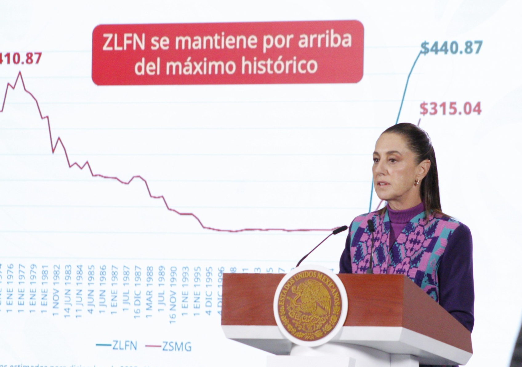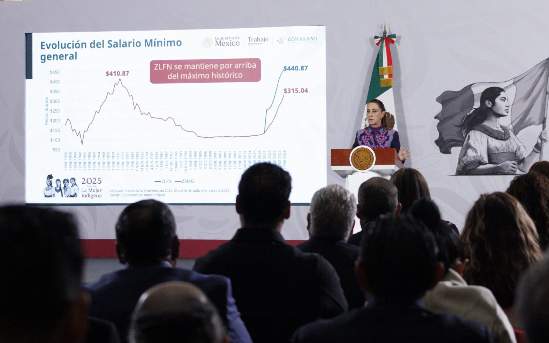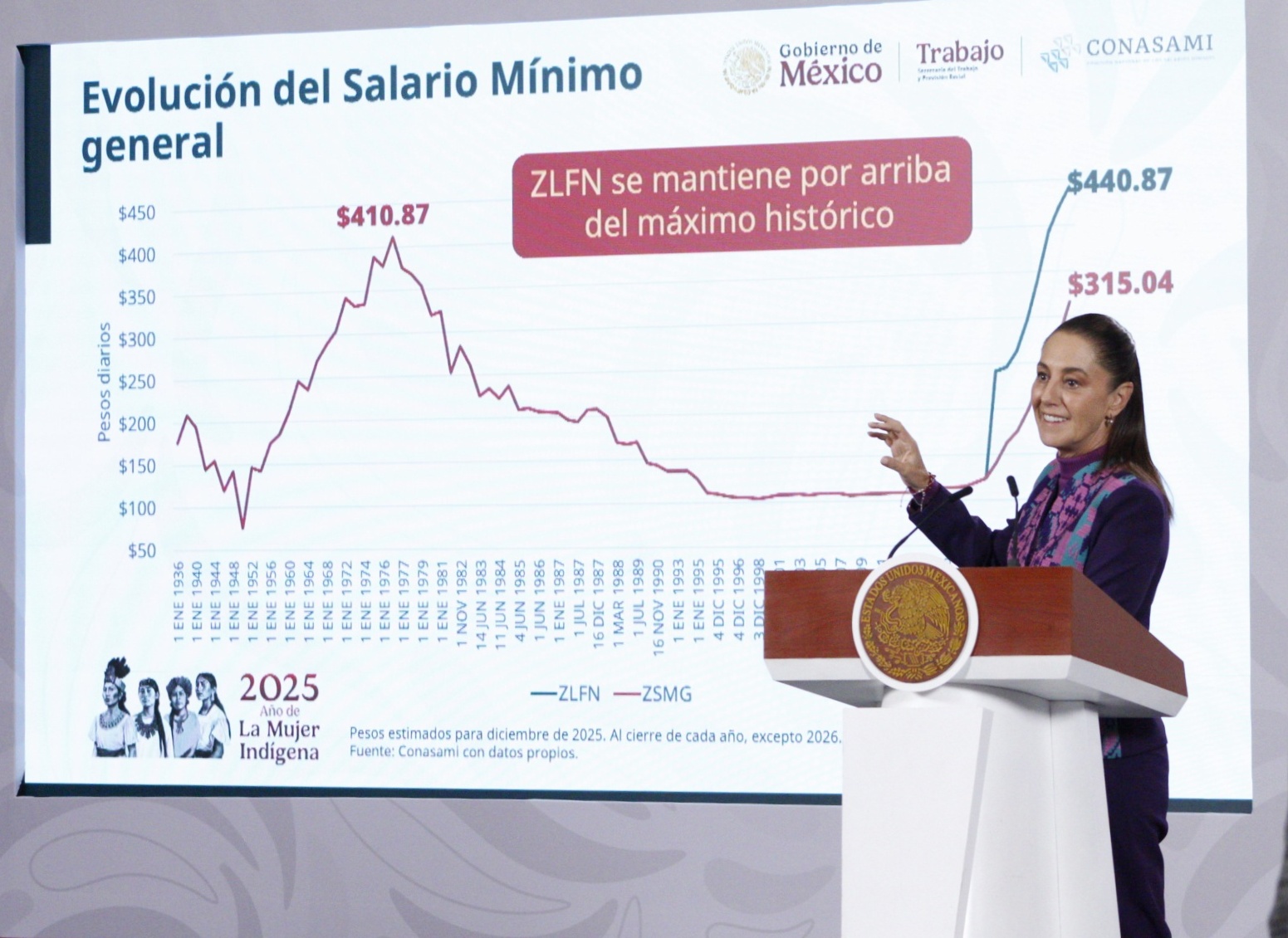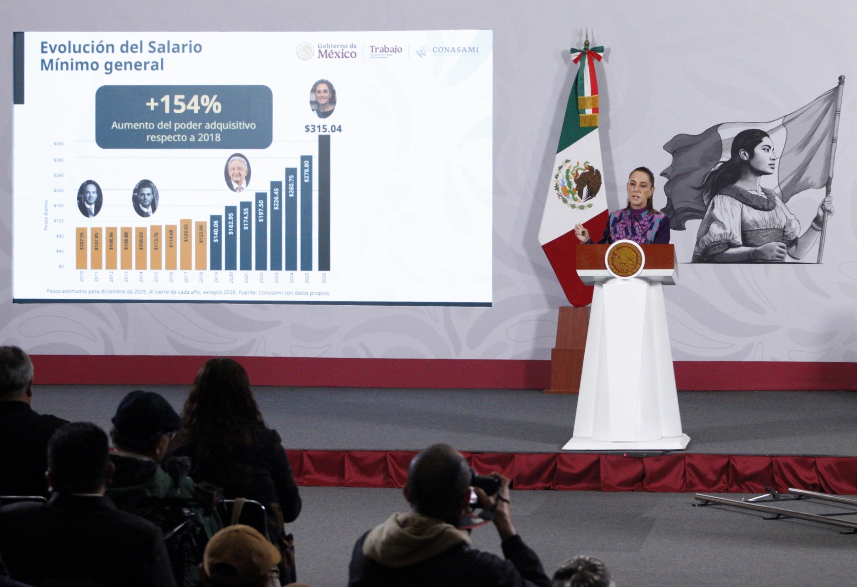 - Aumento del Salario Mínimo: Se anunció un incremento del 13% al salario mínimo para 2026, pasando de 278.80 a 315.04 pesos diarios, lo que representa 9,582.47 pesos mensuales. En la zona de libre frontera, el aumento será del 5%, pasando de 419.88 a 440.87 pesos diarios.