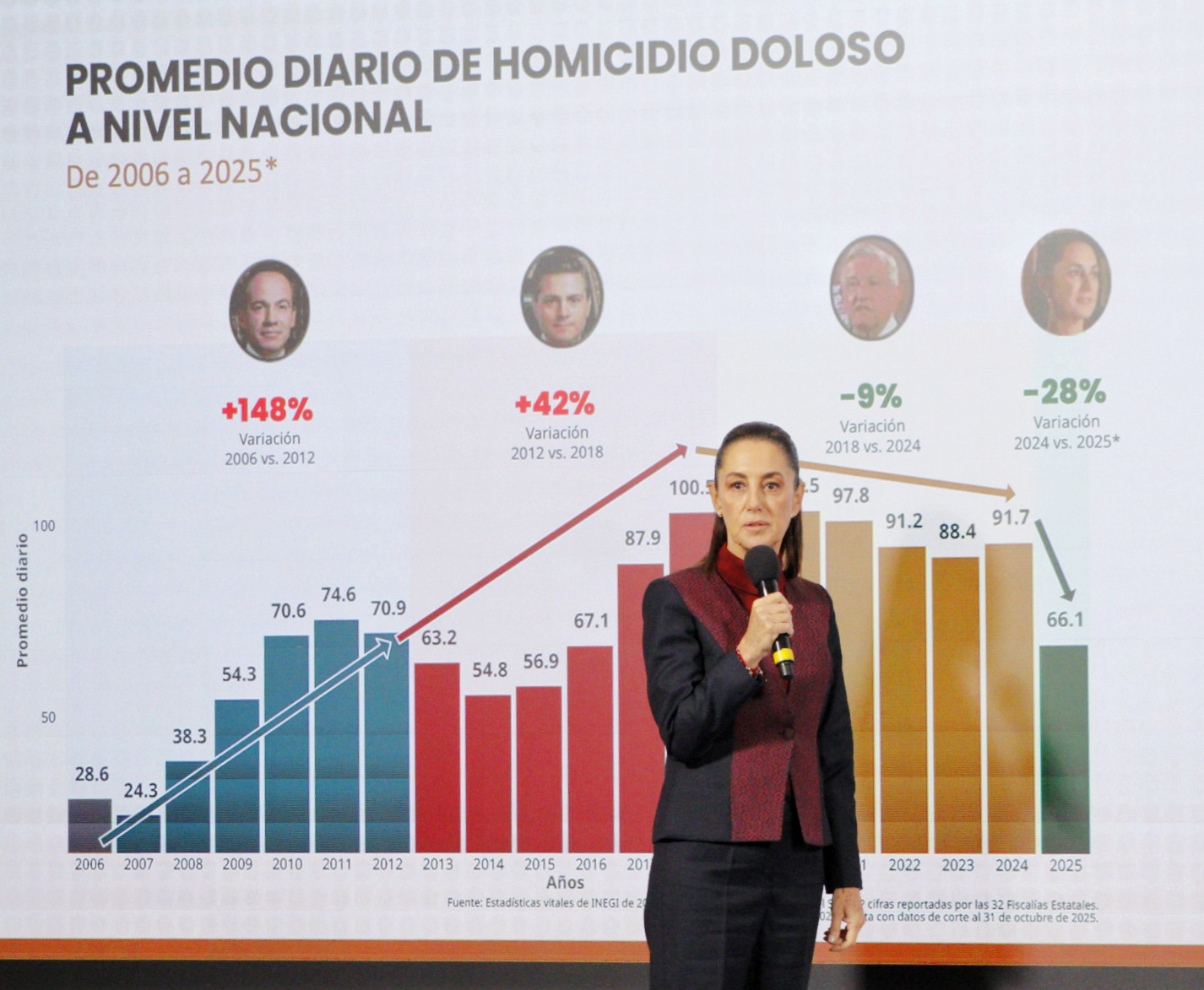 - Disminución de homicidios: Se registró una disminución del 37% en el promedio diario de homicidios dolosos en México, lo que representa 32 asesinatos menos por día.
