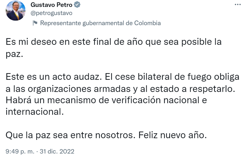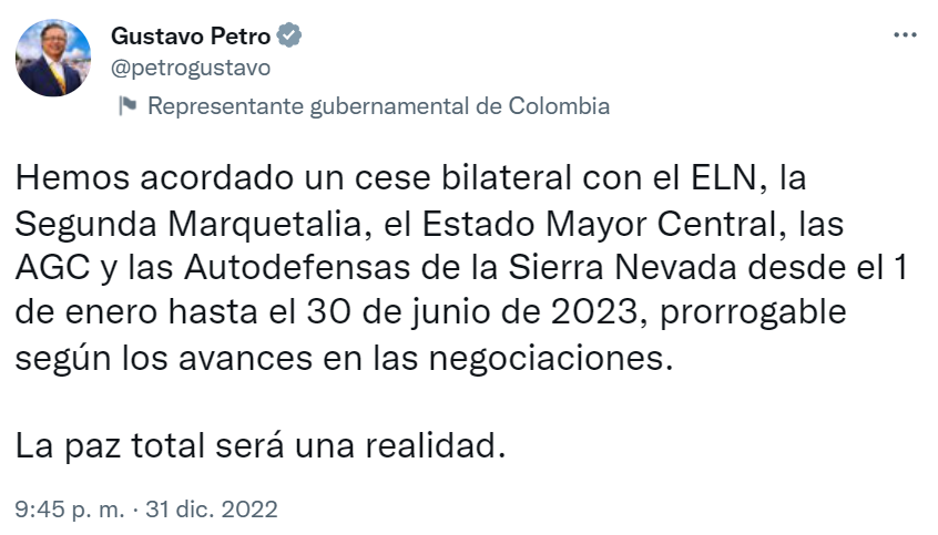 El presidente de Colombia, Gustavo Petro, logró un cese al fuego con cinco grupos armados de su país por seis meses a partir del 1 de enero hasta el 30 de junio de 2023, prorrogable según los avances en las negociaciones.