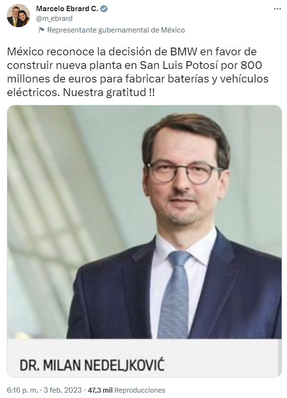 En una ceremonia realizada con autoridades del gobierno mexicano y de la compañía automotriz, desde la planta de fabricación de BMW, Milan Nedeljkovic, integrante del Consejo de Administración de BMW, indicó que la compañía invertirá 800 millones de euros en México para la producción de vehículos eléctricos.