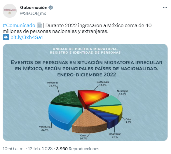 En cuanto a las estadísticas emitidas por las autoridades migratorias mexicanas que registraron en el 2022, el Instituto Nacional de Migración (INM) destacó un total de 444 mil 439 casos de personas migrantes a quienes se les inició un proceso administrativo por no tener una estancia irregular en territorio mexicano.