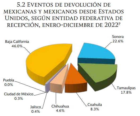 Asimismo, el reporte señala que el estado de Baja California fue el principal punto de entrada a Estados Unidos que usaron los connacionales deportados, ya que se contabilizaron 118 mil 633 eventos de deportación, lo que significó 46% del total. Sonora fue el segundo punto de acceso por el que más personas mexicanas ingresaron al país norteamericano, con un registro de 58 mil 316 eventos de deportación de mexicanos, equivalente al 23%.